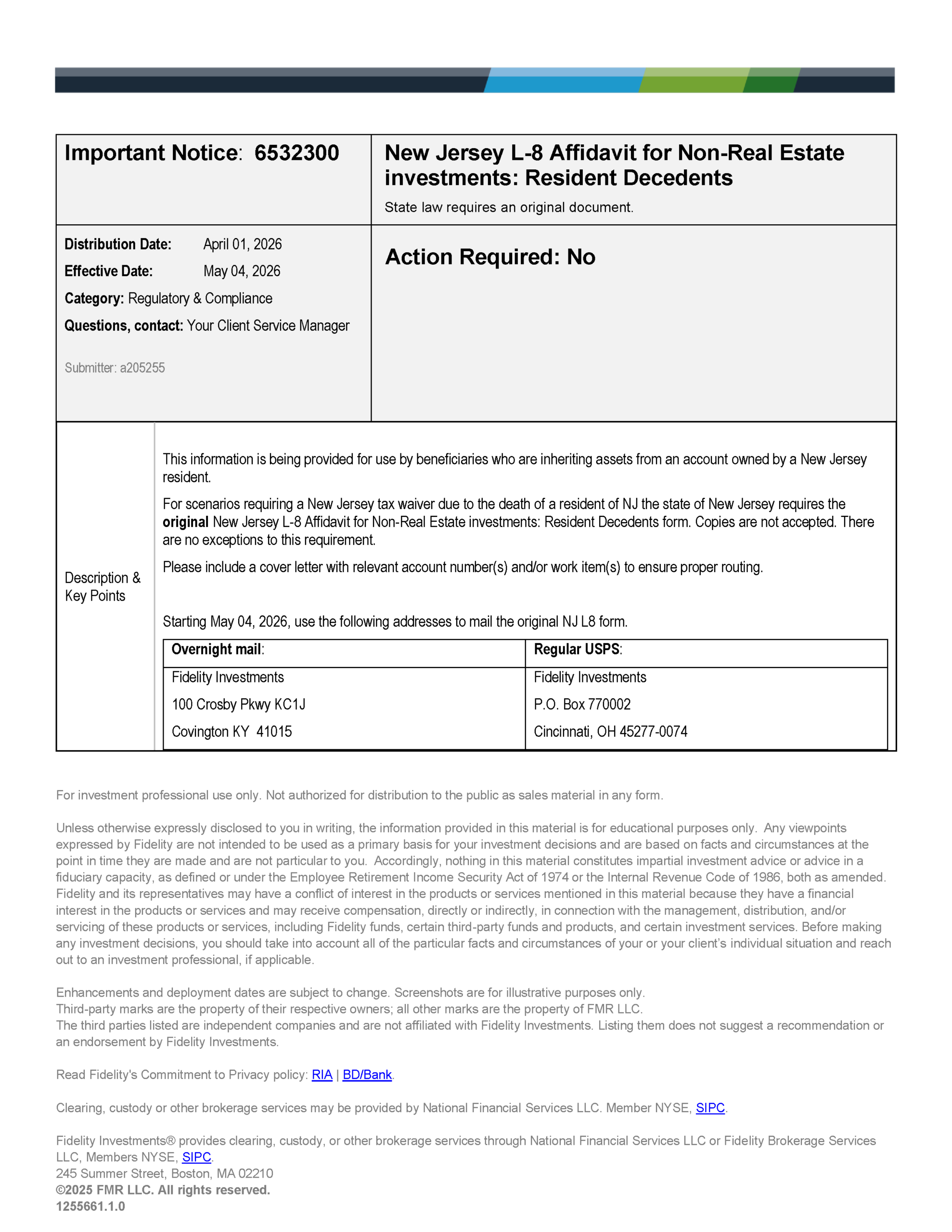 Beginning May 4, 2026, Fidelity must be provided with the original document by mail. There are no exceptions to this requirement. The form should be accompanied by a cover letter, listing any relevant account numbers or work item numbers. Work item numbers can be provided by the Advisory Operations team, if needed. Please mail the cover letter and tax waiver to one of the addresses below. As always, please reach out to a member of the Advisory Operations Team with any questions.