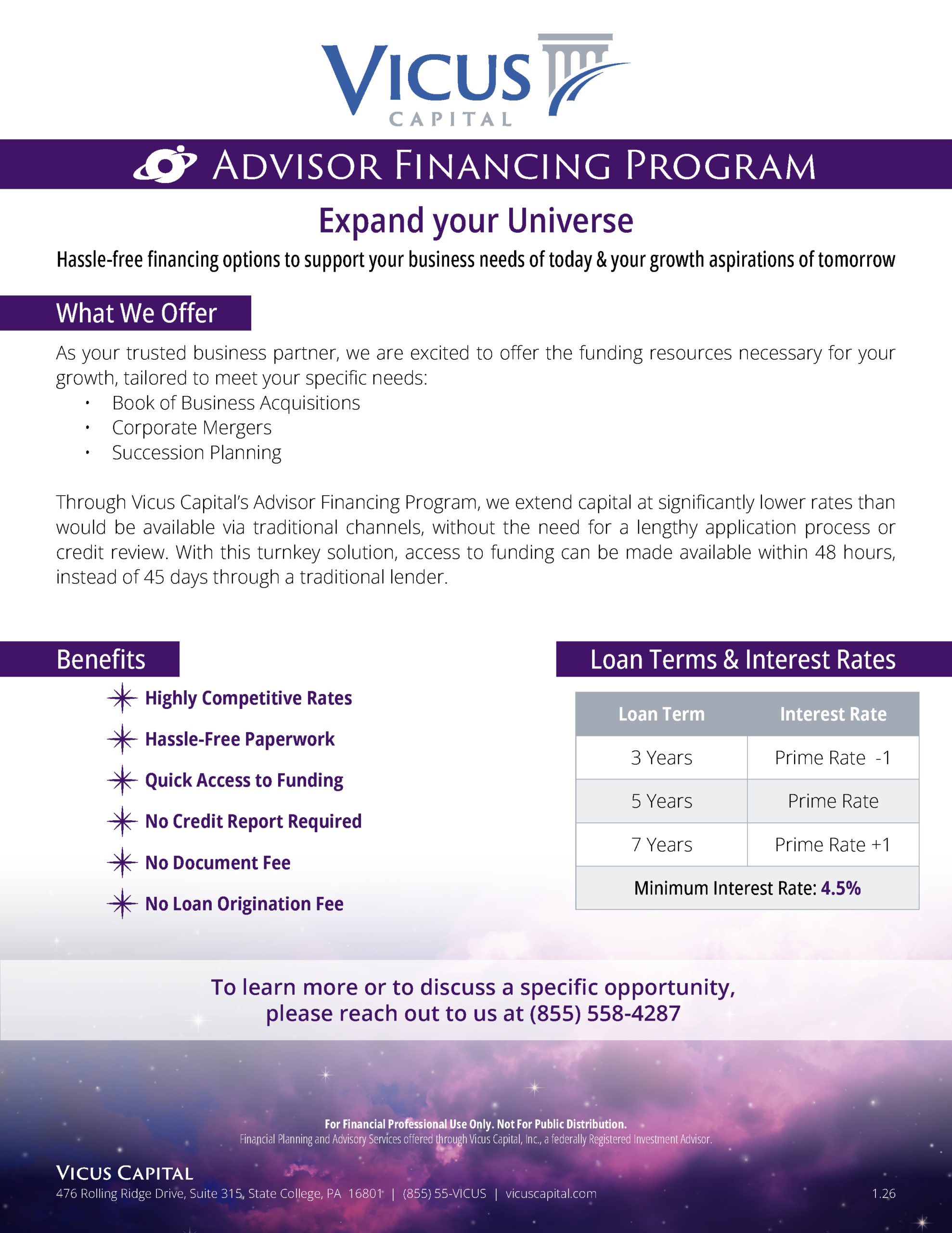 Through Vicus Capital’s Advisor Financing Program, we extend capital at significantly lower rates than would be available via traditional channels, without the need for a lengthy application process or credit review. With this turnkey solution, access to funding can be made available within 48 hours, instead of 45 days through a traditional lender.