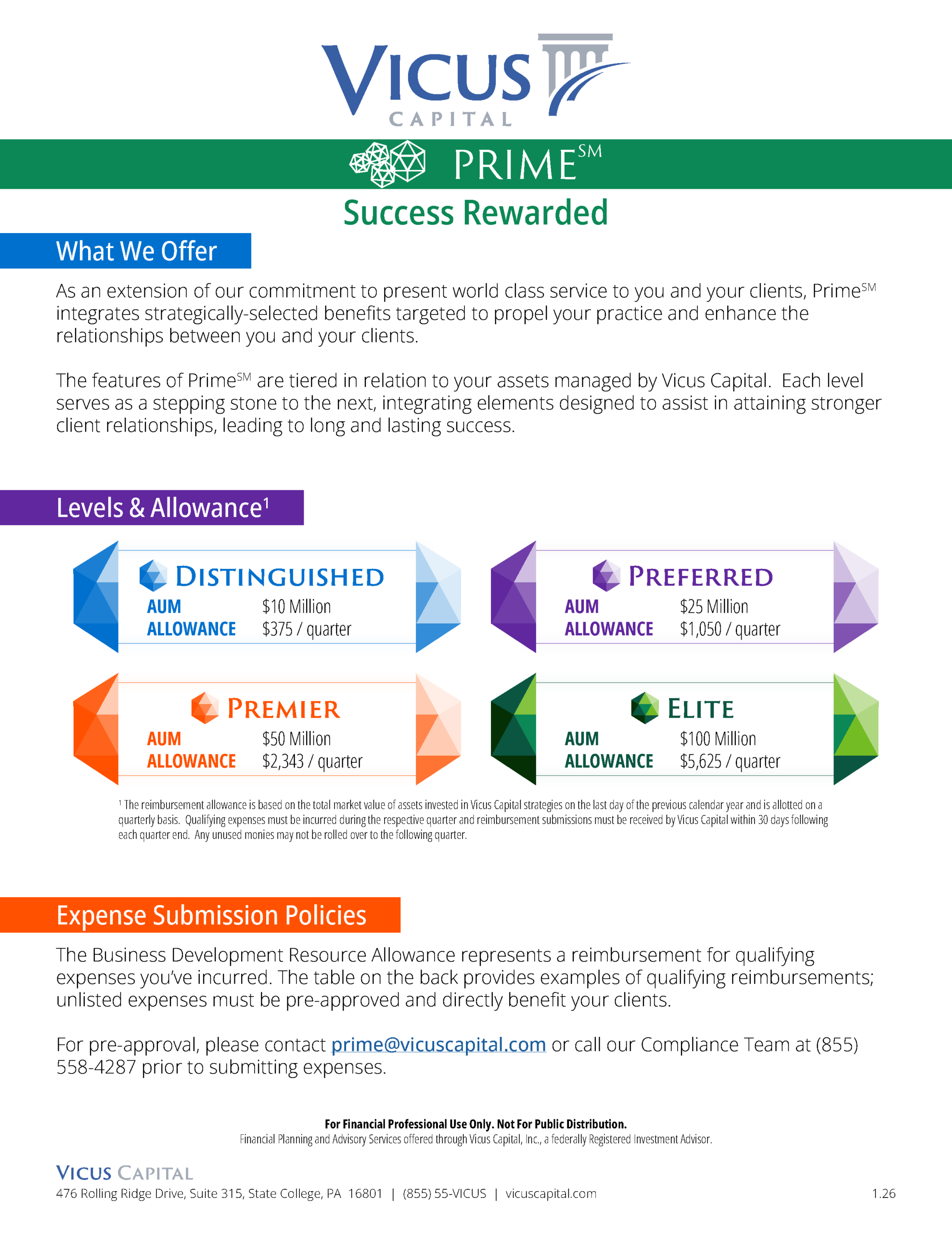 1 The reimbursement allowance is based on the total market value of assets invested in Vicus Capital strategies on the last day of the previous calendar year and is allotted on a quarterly basis. Qualifying expenses must be incurred during the respective quarter and reimbursement submissions must be received by Vicus Capital within 30 days following each quarter end. Any unused monies may not be rolled over to the following quarter.