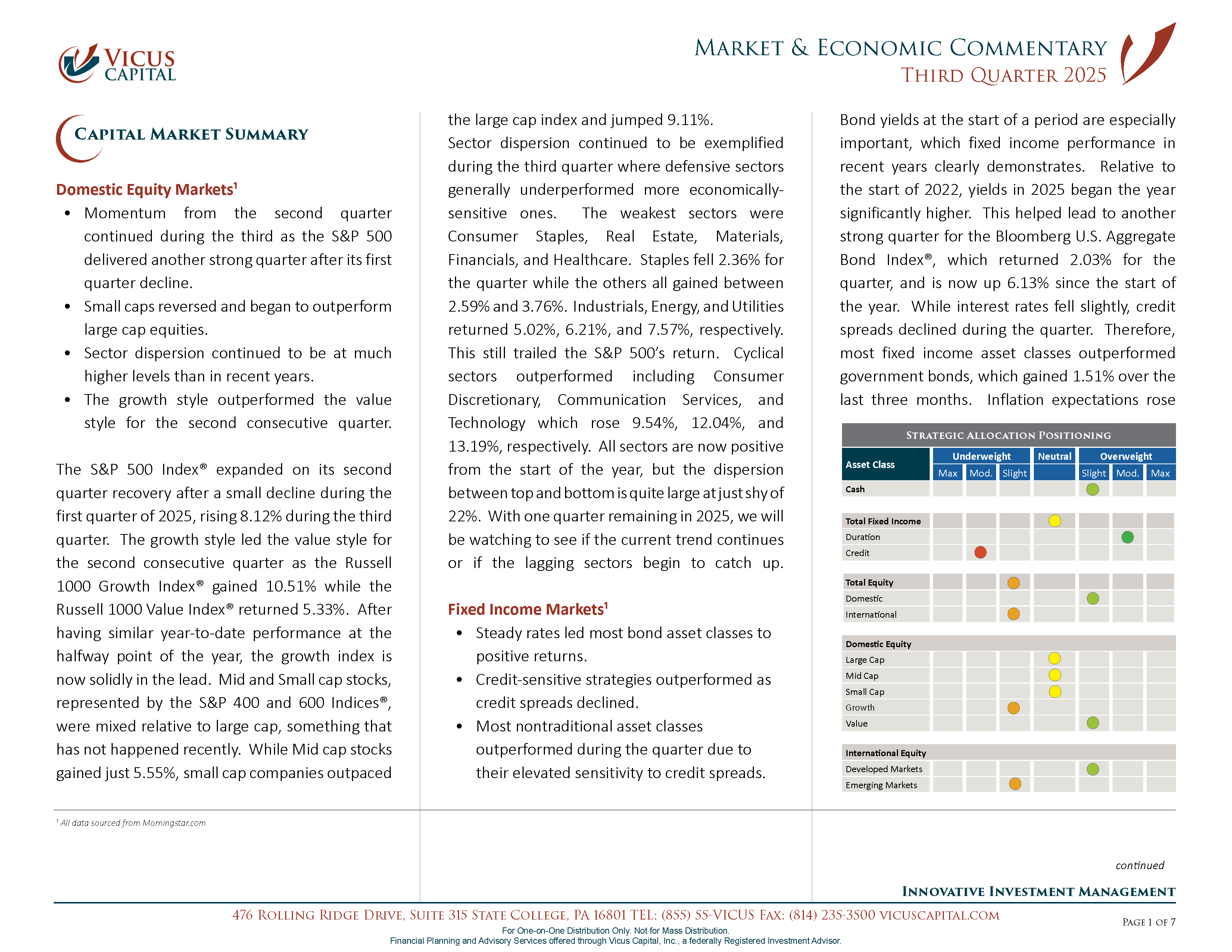 This Q3 market commentary details the drivers of market movement and perspectives on the economic events that shaped the third quarter of 2025. Included in the commentary is our firm-level asset class views, in graphic format, for an added layer of insight into what drives our portfolio positioning methodology. Additionally, you will find our Capital Market Outlook offering our perspectives on the storylines we anticipate will shape the quarters ahead.