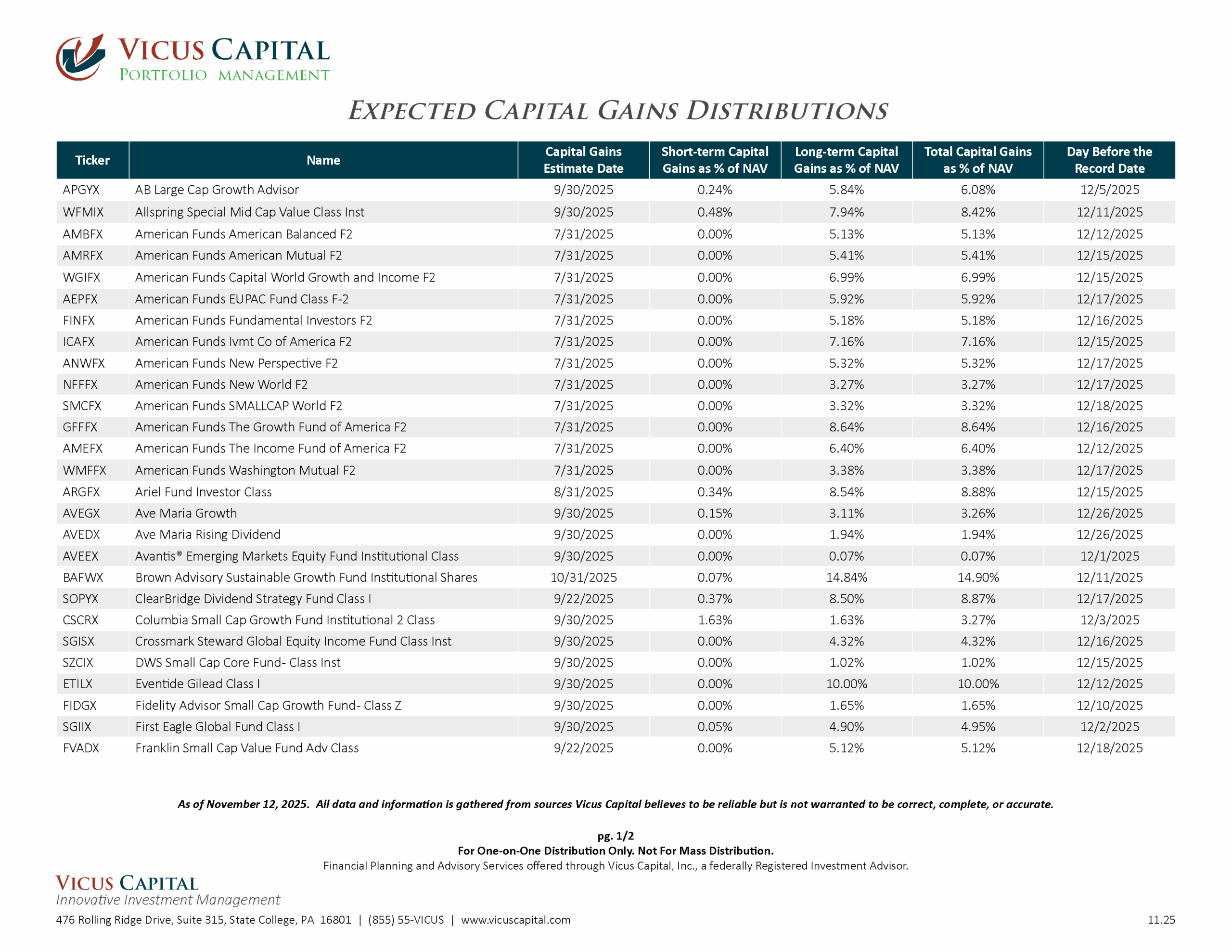 As we approach the month of December, some mutual funds will begin distributing capital gains. The investment management team is working to provide you with estimates as they become available for funds utilized in portfolios, allowing you to plan accordingly in non-qualified accounts.